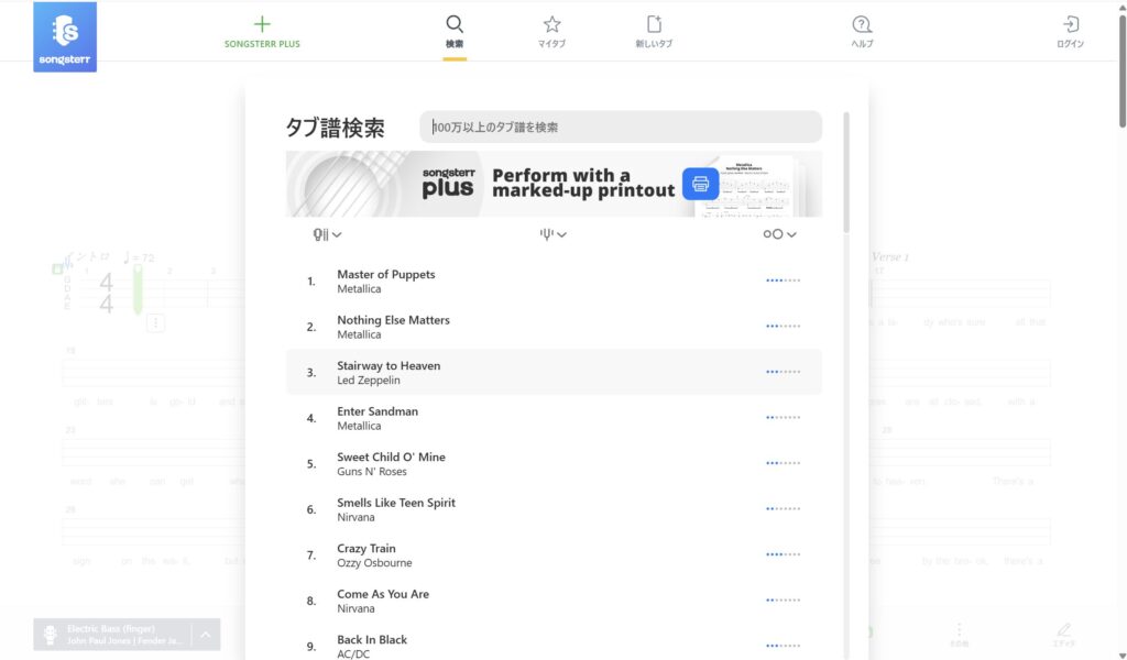 国内の楽譜サイトで見つからなかった曲でも、Songsterrで英語の曲名を入れれば一発で見つかることが多いです。